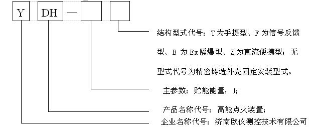 高能點火裝置的型號標記由企業名稱代號、產品名稱代號、主參數及結構型式代號4部分組成。\